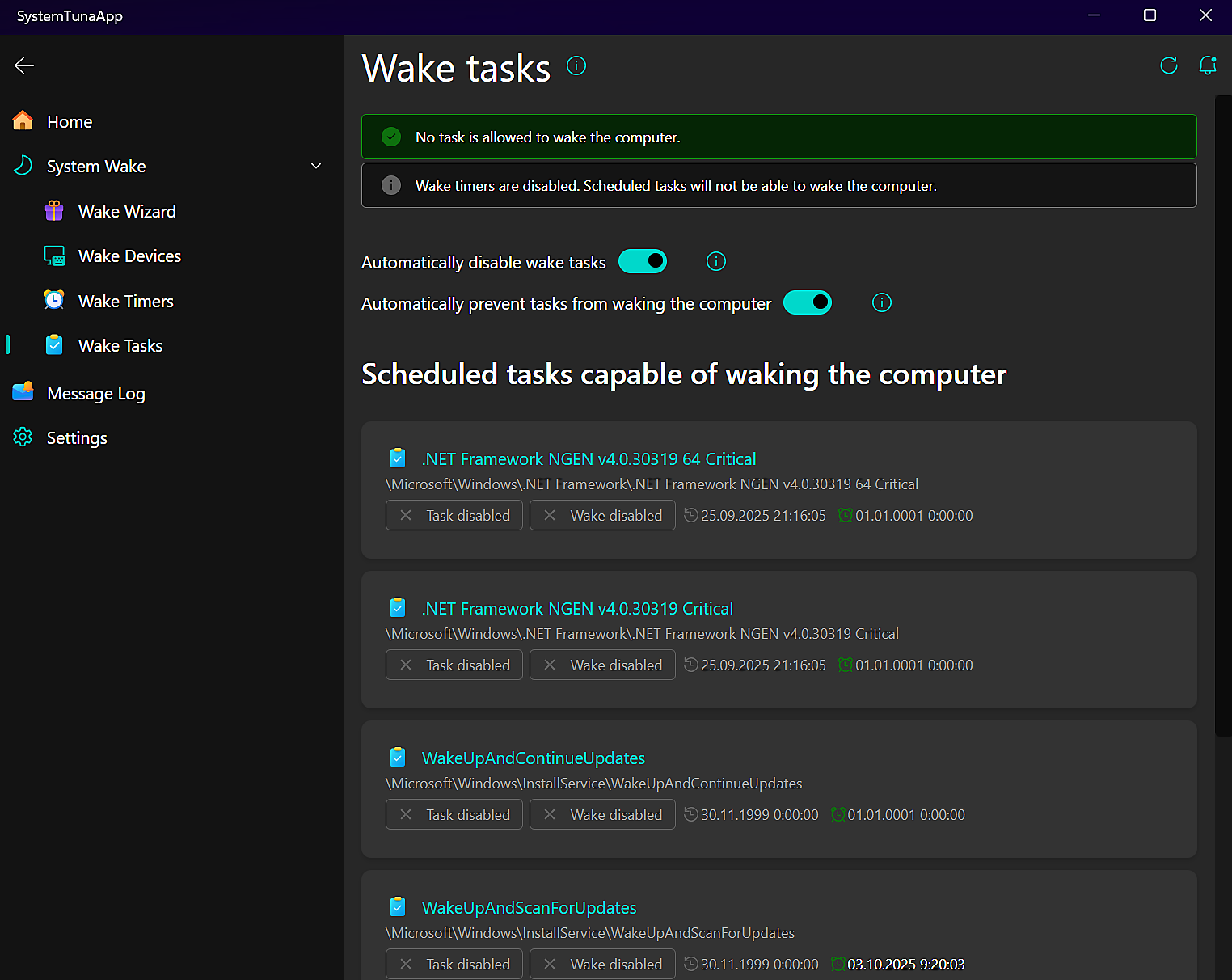 Some scheduled tasks on Windows can wake your computer for updates or maintenance. SystemTuna helps you find and disable the wake capability of these tasks, and can automatically prevent new ones from waking your system. SystemTuna can also fully disable the wake tasks like Windows Update if needed.